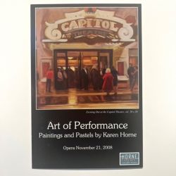 Over our two decade history we explored a new approach – curating intriguing group and solo theme shows, rather than focusing primarily on artist-centered shows. These themes have included Splash!, Headscapes, Dusk to Dawn Nightscapes, Skyscapes, Glorious Food, Travelogue, Painting La Primavera, Moving Inside, Body & Soul, Blooms, Mother Earth, Hollyhock Walks, Town and Country, Making a Splash!, The Color of Night, A Walk in the Park, Art of Performance, Poetry of Trees, Roman Holiday, Bright Lights Big Cities, 15th Anniversary Splash!, Exploring RED, Ballet to Tango, Step into Spring, April Showers May Flowers, Dine O’Round in Paint I & II, and Al Fresco, among others.