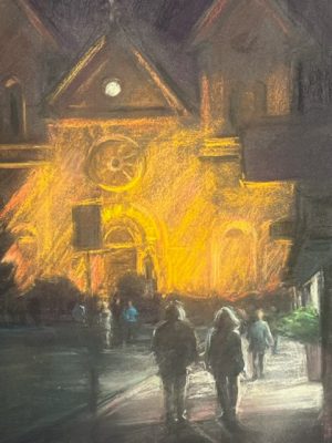 “I’m awed by the way historic cathedrals, temples, and other religious buildings serve as physical symbols of divine glory. Whenever I visit Santa Fe, I’m so aware of the Cathedral Basilica of St. Francis, a monumental stone church. With its grand facade, it serves as a focal point for the neighborhood, a community gathering place, and visually transports visitors to another sphere. In this painting, I aimed to capture how this cathedral rises up in the background, silhouettes pedestrians, and provides a spiritual and architectural touchstone.”